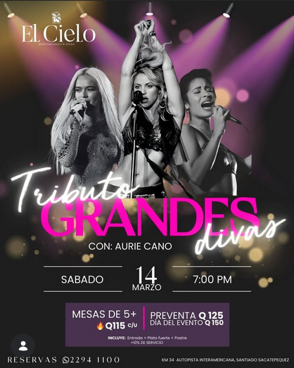 ¡Celebra a las reinas de la música! Tributo Grandes Divas con Aurie Cano, este 14 de marzo en El Cielo. Una cena-concierto espectacular, vibrante y llena de sabor que incluye plato fuerte y postre. ¡Reserva tu mesa hoy mismo!.
